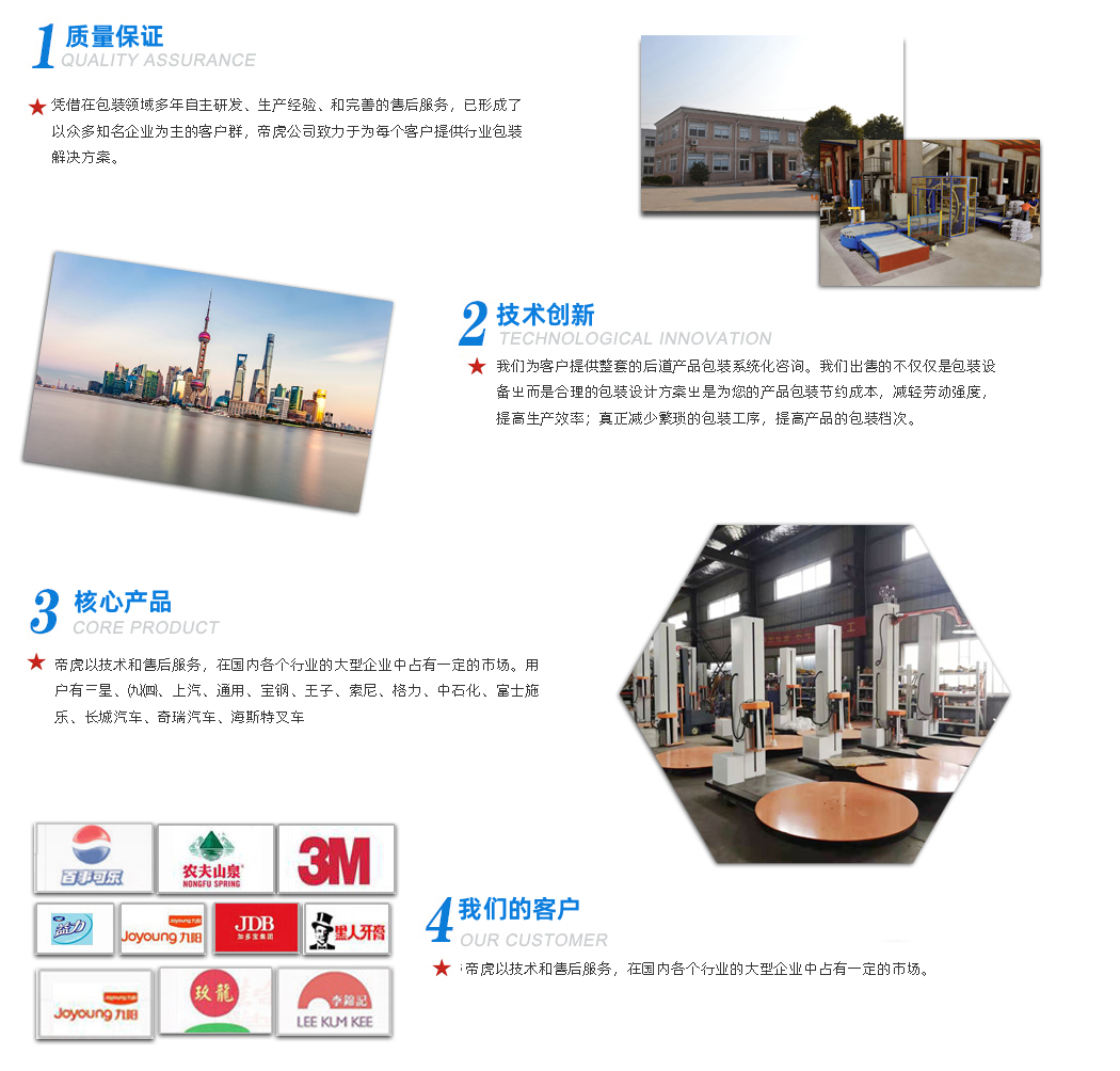 帝虎包裝設(shè)備(上海)有限公司是一家從事現(xiàn)代物流一體化運(yùn)輸包裝解決方案的專(zhuān)業(yè)提供商!公司自成立至今,憑借在包裝領(lǐng)域多年自主研發(fā)、生產(chǎn)經(jīng)驗(yàn)、和完善的售后服務(wù),已形成了以眾多知名企業(yè)為主的客戶(hù)群,帝虎公司致力于為每個(gè)客戶(hù)提供行業(yè)包裝解決方案。